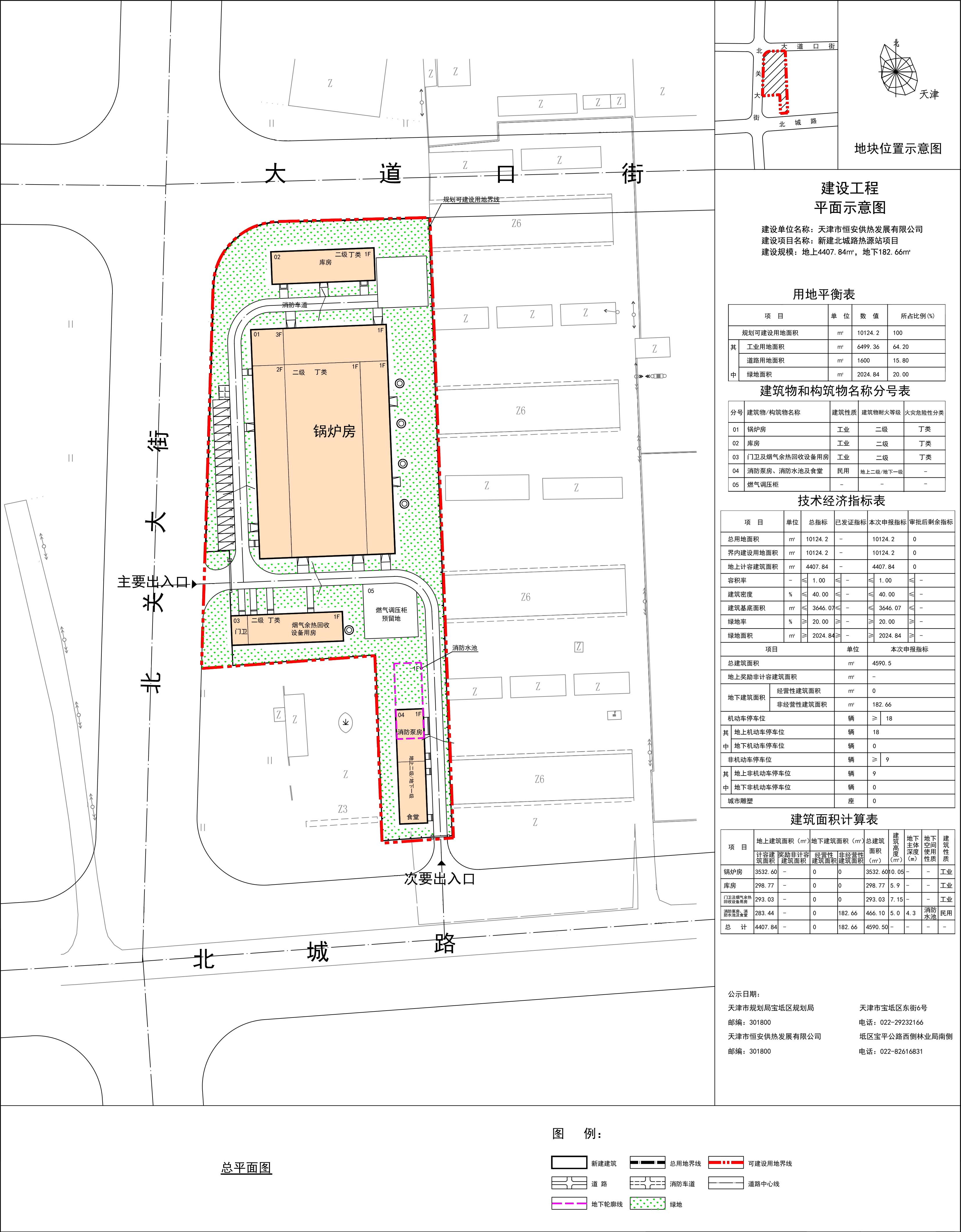 天津市恒安供热发展有限公司申请的新建北城路热源站锅炉房、库房、门卫及烟气余热回收设备用房、消防泵房、消防水池及食堂项目建设工程设计方案总平面图公布