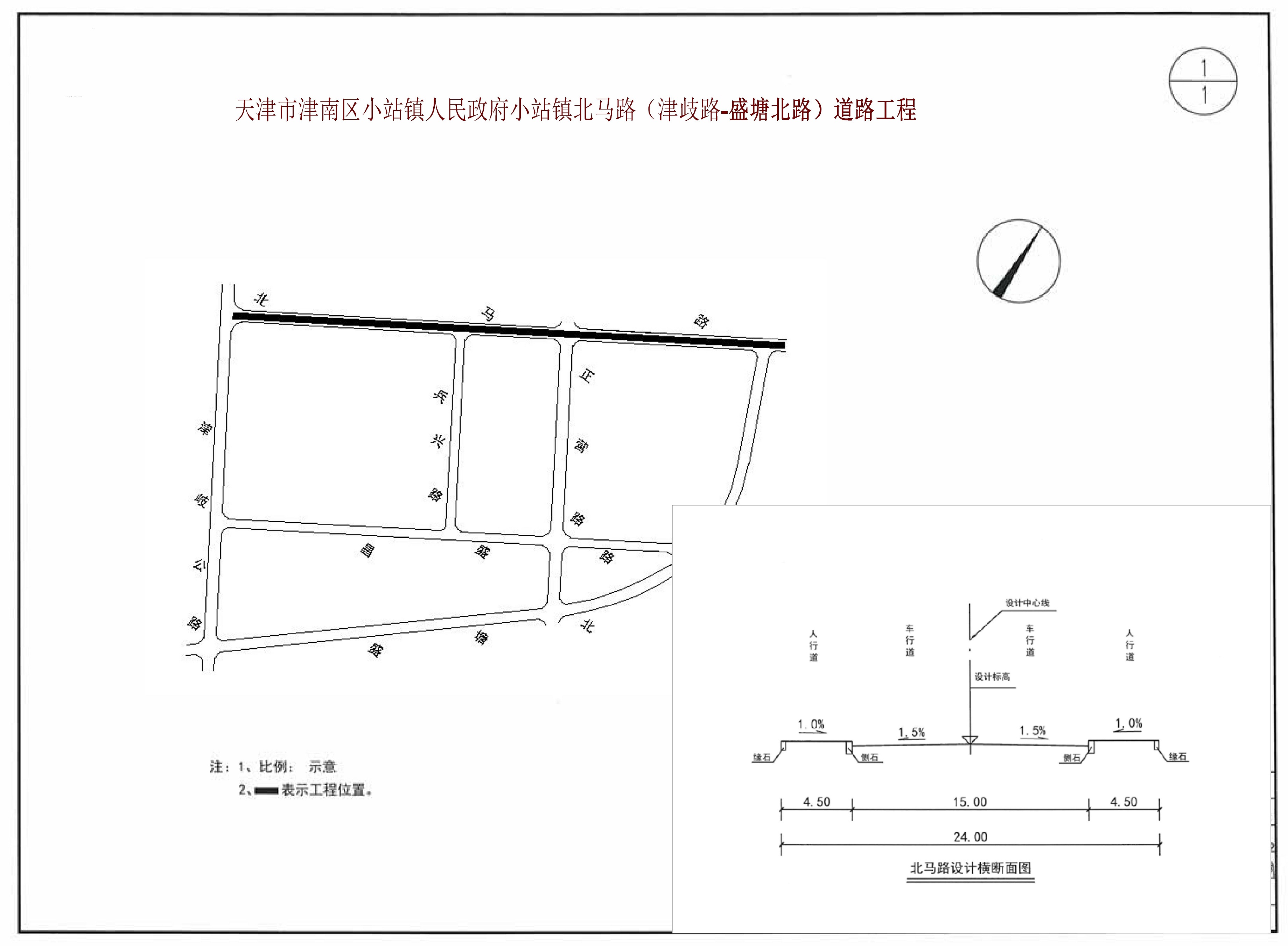 )道路工程位于小站镇,道路等级为城市主干路,本次实施建设道路红线宽度为
