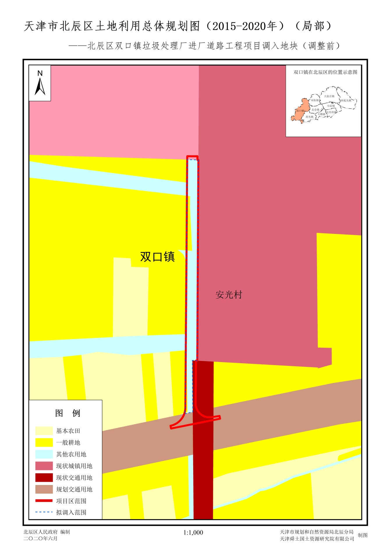 北辰区双口镇垃圾处理厂进场道路(双成路)工程项目位于北辰区双口镇安光村,服务于北辰区双口镇新建的垃圾焚烧厂,是为满足北辰区双口镇垃圾焚烧厂出入需要所修建的。本次规划修改是对地块范围内不合规的部分进行填平补齐,项目区占地面积为0.3702公顷,需调整面积为0.3067公顷。