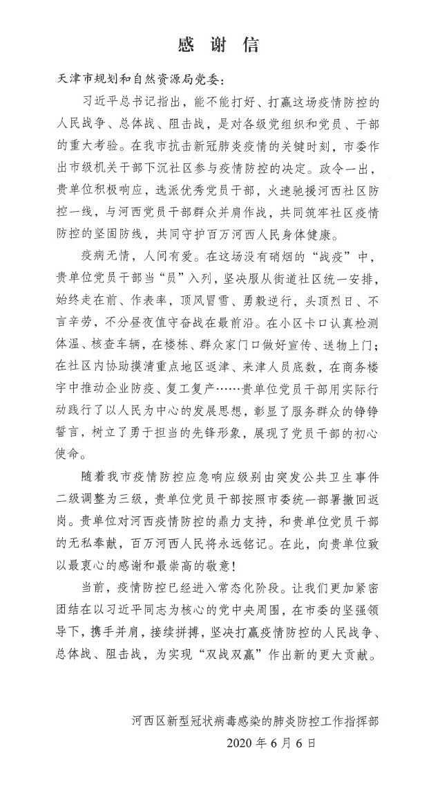 按语:新冠肺炎疫情防控工作是一场人民战争。市规划资源局党员干部积极响应全市机关干部下沉到社区(村)一线的号召,闻令而动,纷纷走出机关、办公室,投身到新冠疫情防控阻击战中,与社区干部一起,把好基层防疫关口。日前,河西区新型冠状病毒感染的肺炎防控工作指挥部致信,向市规划资源局党委对区疫情防控工作的大力支持和党员干部的无私奉献表示感谢。“感谢信”主要内容如下。