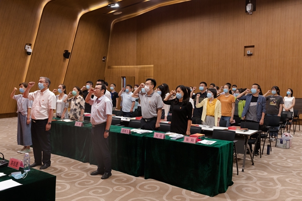 其后,黄克力同志带领全体党员重温入党誓词,党员们集体起立,举起右手,握紧拳头,面向庄严的党旗,重温入党誓词:“我志愿加入中国共产党,拥护党的纲领,遵守的党的章程,履行党员义务……随时准备为党和人民牺牲一切。”入党誓词铮铮,鞭策和激励充盈耳畔。而后,全体党员齐唱《没有共产党就没有新中国》,回顾中国共产党从最初的星星之火,历经各种艰难险阻,一步一个脚印,慢慢形成燎原之势,最终实现伟大跨越的艰辛历程。全体党员更是明晰了自己的责任与担当。