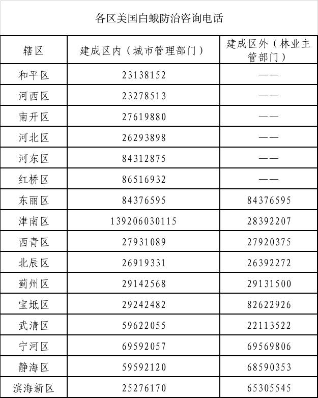 首先,广大市民发现美国白蛾不必惊慌,是可防可控的;其次,美国白蛾本身不带毒性,也不会对人体造成危害。如发现美国白蛾虫害聚集点位,请第一时间拨打天津政务服务热线12345,或者通知辖区物业、街道等绿化管护单位。另外,建成区内也可联系城市管理部门,建成区外可联系林业主管部门,咨询电话见下表,以便及时协调相关责任部门开展防治,实现有虫不成灾。