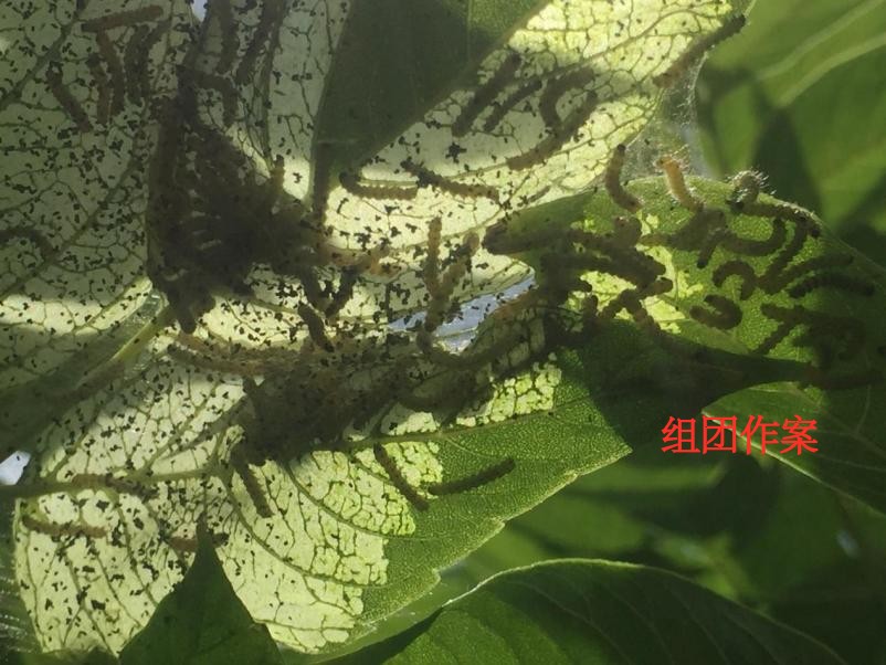 4)组团作案:初孵幼虫有群集性,吐丝缀叶形成网幕,在网内取食叶片。5龄后幼虫爬出网幕单独活动、取食。