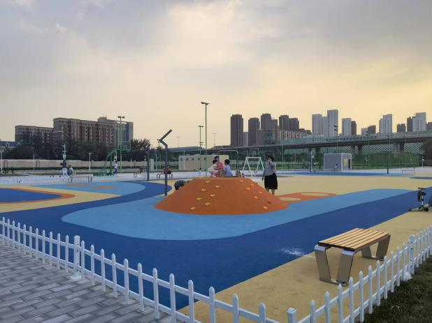 市土地利用中心将该地块东侧部分储备土地通过临时利用方式,提供建设集运动、休闲、社交、市集、停车为一体的多功能体育活动场地,场内设置了儿童无动力乐园、绿荫足球场、活力篮球场等体育设施,并将便民集装箱市集、停车场嵌入公园,打造了全龄友好、功能复合的活力空间。