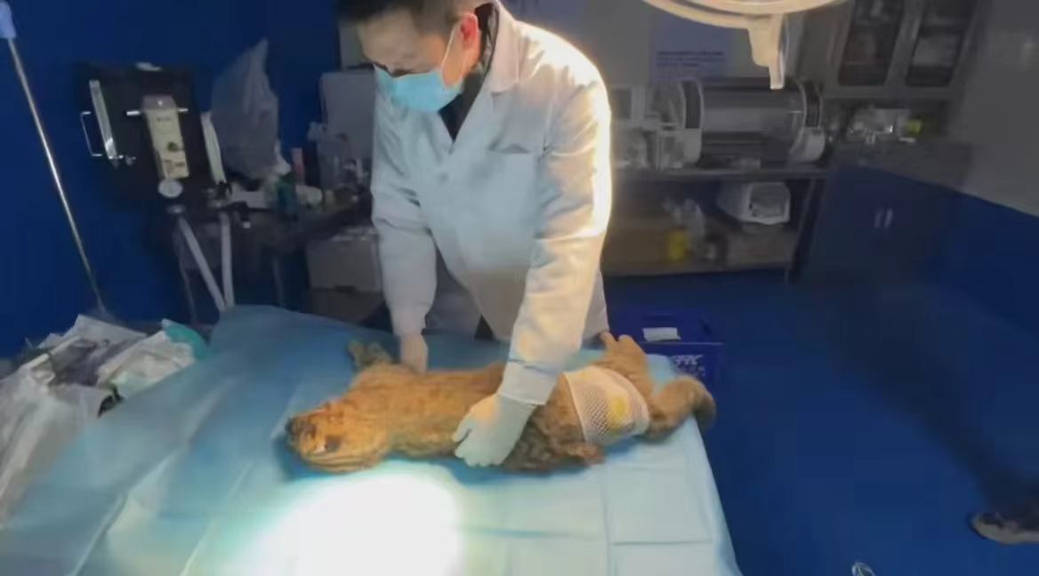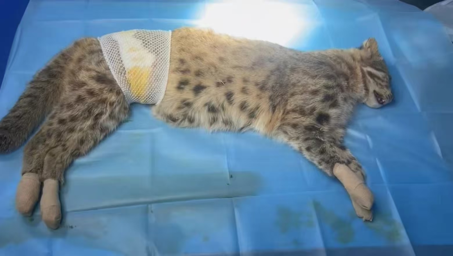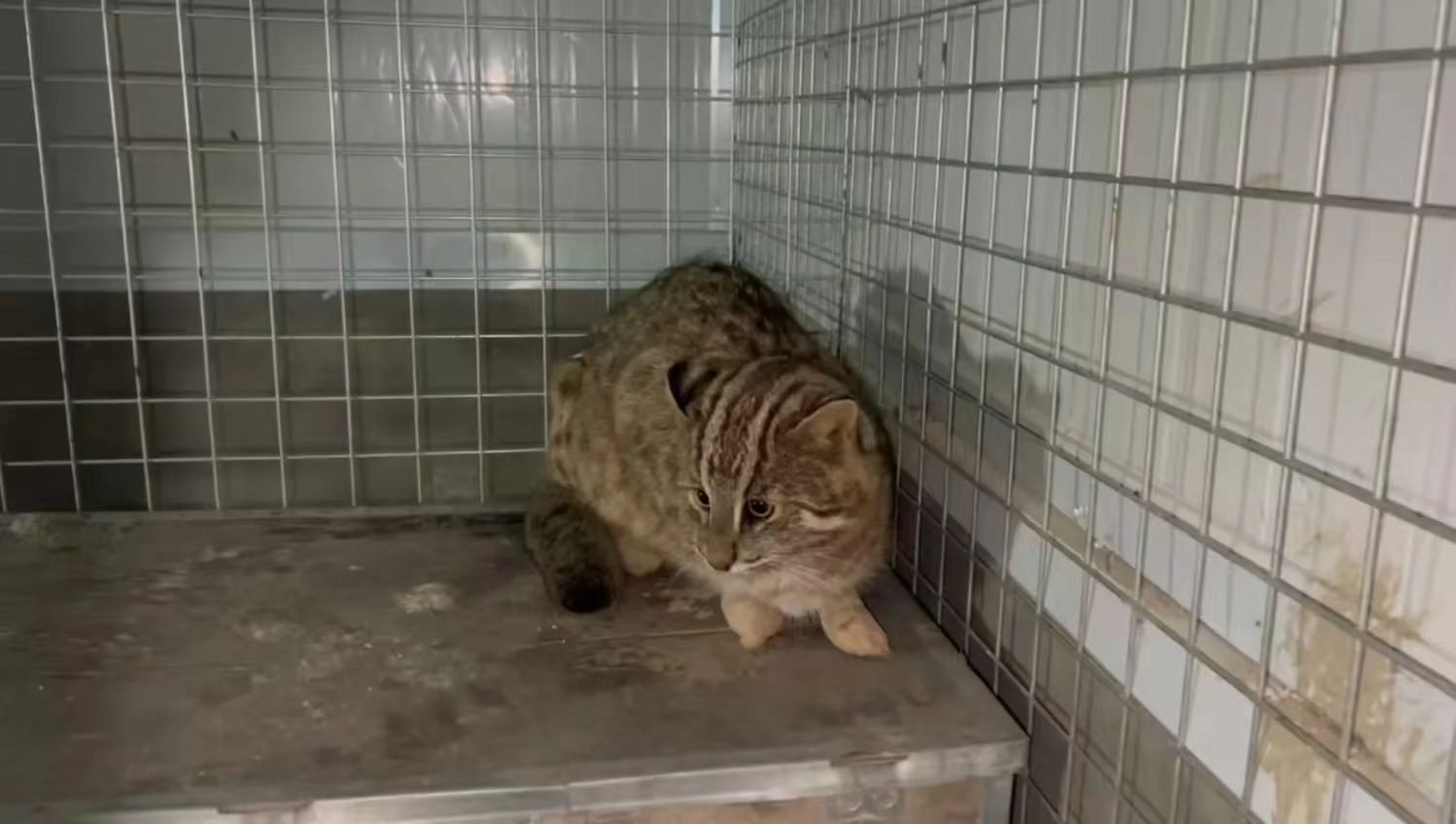 2025年12月16日清晨,蓟州区出头岭镇森林防火巡护员在日常巡护中,发现一只成年雄性豹猫被困在护路铁丝网上,足部磨损、指甲断裂且腹部有明显伤口,正处于应激挣扎状态。巡护员第一时间上报后,区林业局、镇政府迅速联动市野生动物救护中心北部片区救护站点,携带专业保定器、断线钳等工具赶赴现场,仅用20分钟便安全解救这只野生豹猫。经初步检查,该豹猫体重9.25公斤,属北方亚种成年个体,虽体表受伤但无重大健康风险,随即被送往北部片区救护站点接受系统救治。