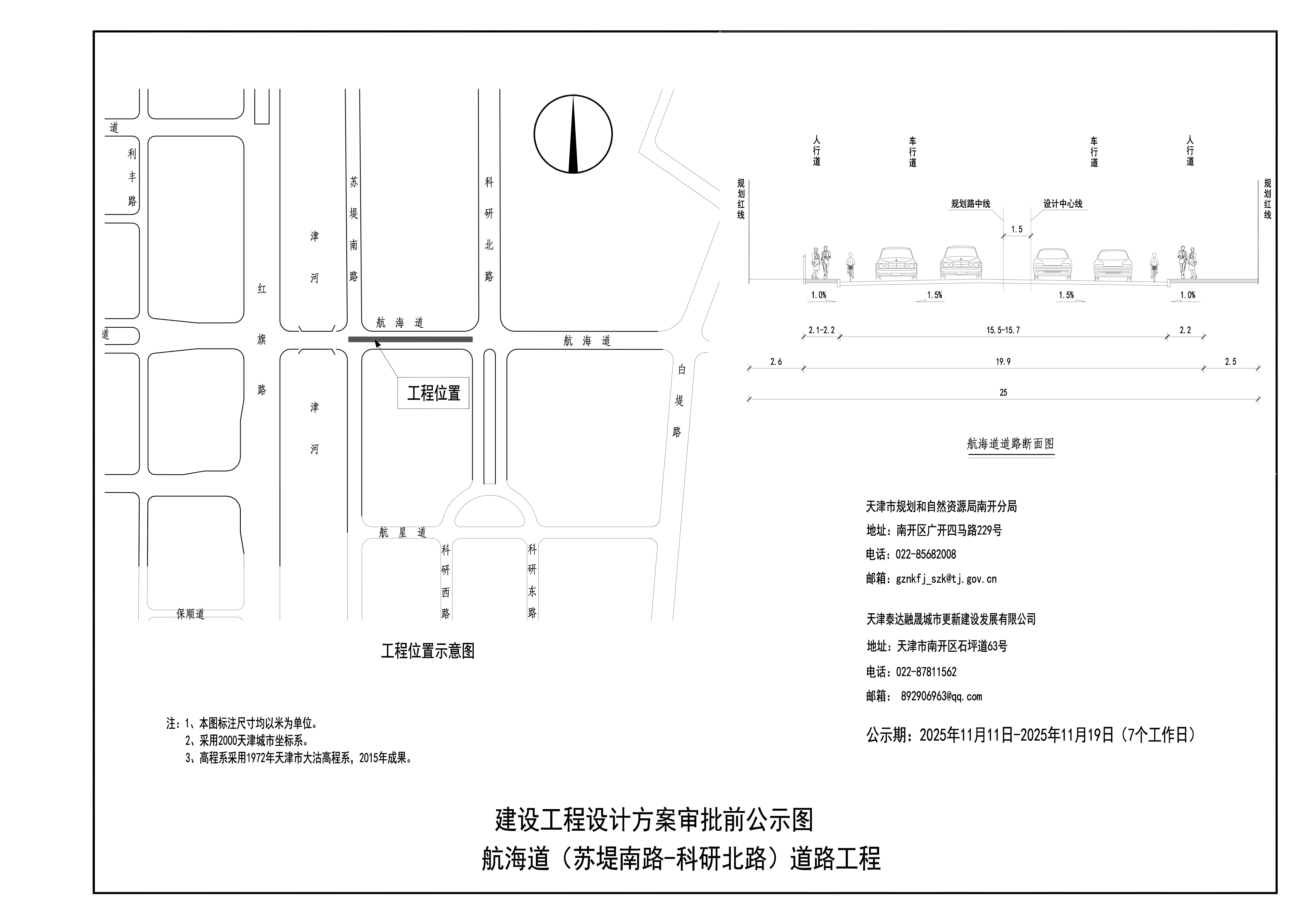 按照《中华人民共和国城乡规划法》要求,现将航海道(苏堤南路—科研北路)道路工程建设工程设计方案(位置示意图、横断面图)予以公示,公示时间为2025年11月11日至2025年11月19日。