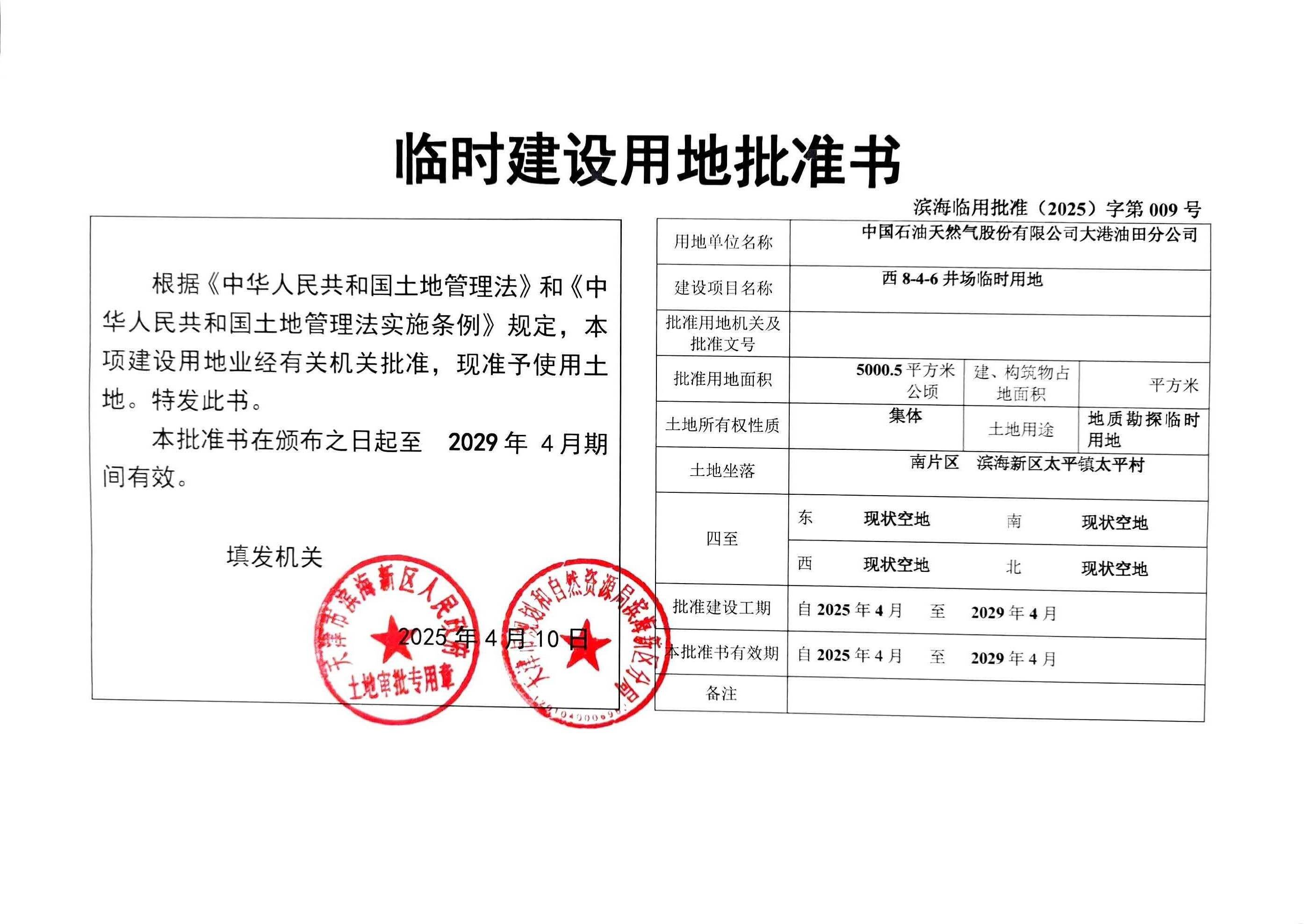 依据《自然资源部关于规范临时用地管理的通知》及《天津市临时用地管理办法》的有关要求,现将大港油田西8-4-6井场临时建设用地批准书进行公告。