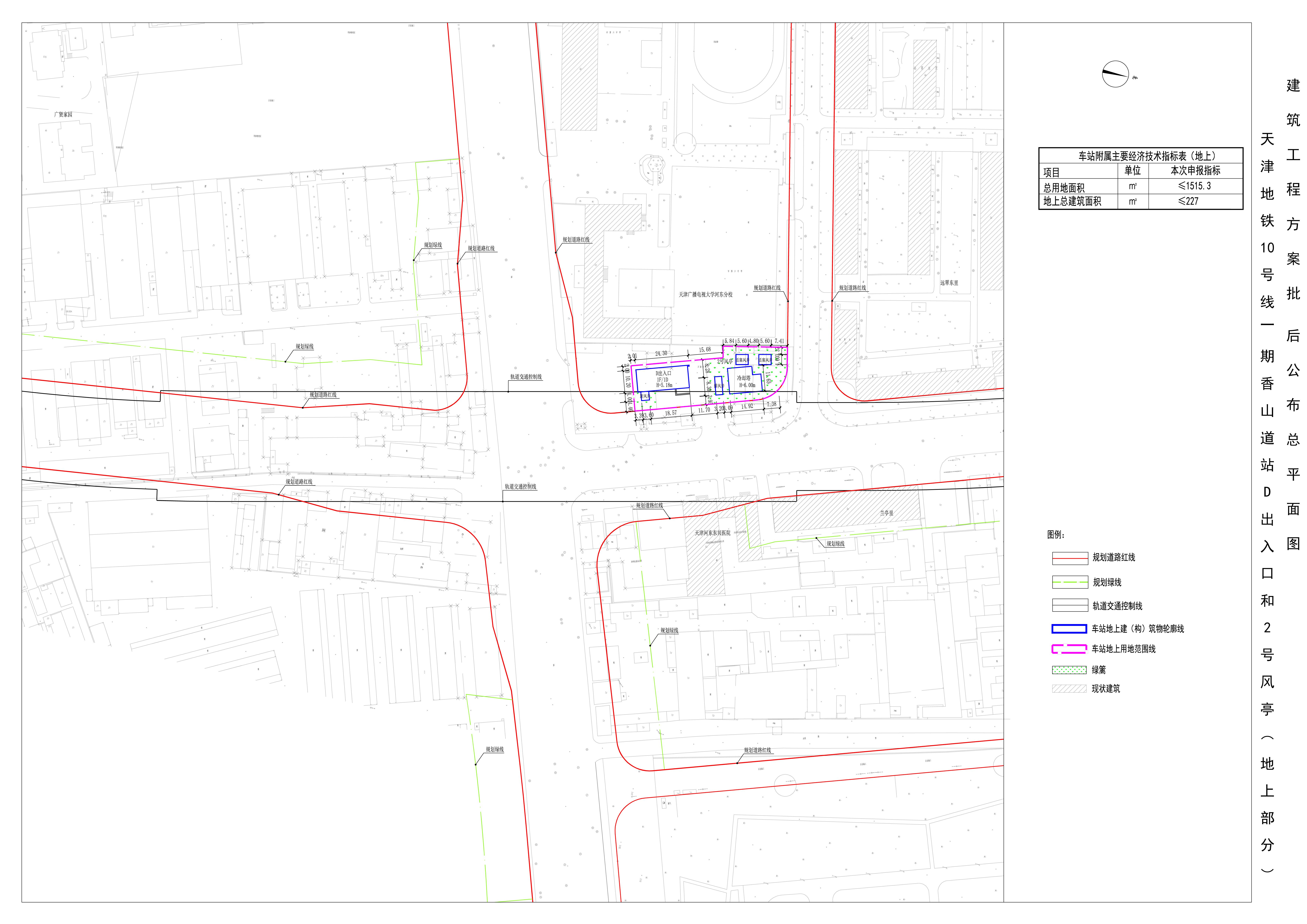 天津市规划和自然资源局河东分局于2022年5月24日核发了天津地铁10号线一期工程香山道站附属工程D出入口及2号风亭地上部分项目建设工程规划许可证,依据《中华人民共和国城乡规划法》及住房和城乡建设部《关于城乡规划公开公示的规定》的有关要求,现将该项目建设工程设计方案总平面图公布,公布时间至项目规划验收合格。