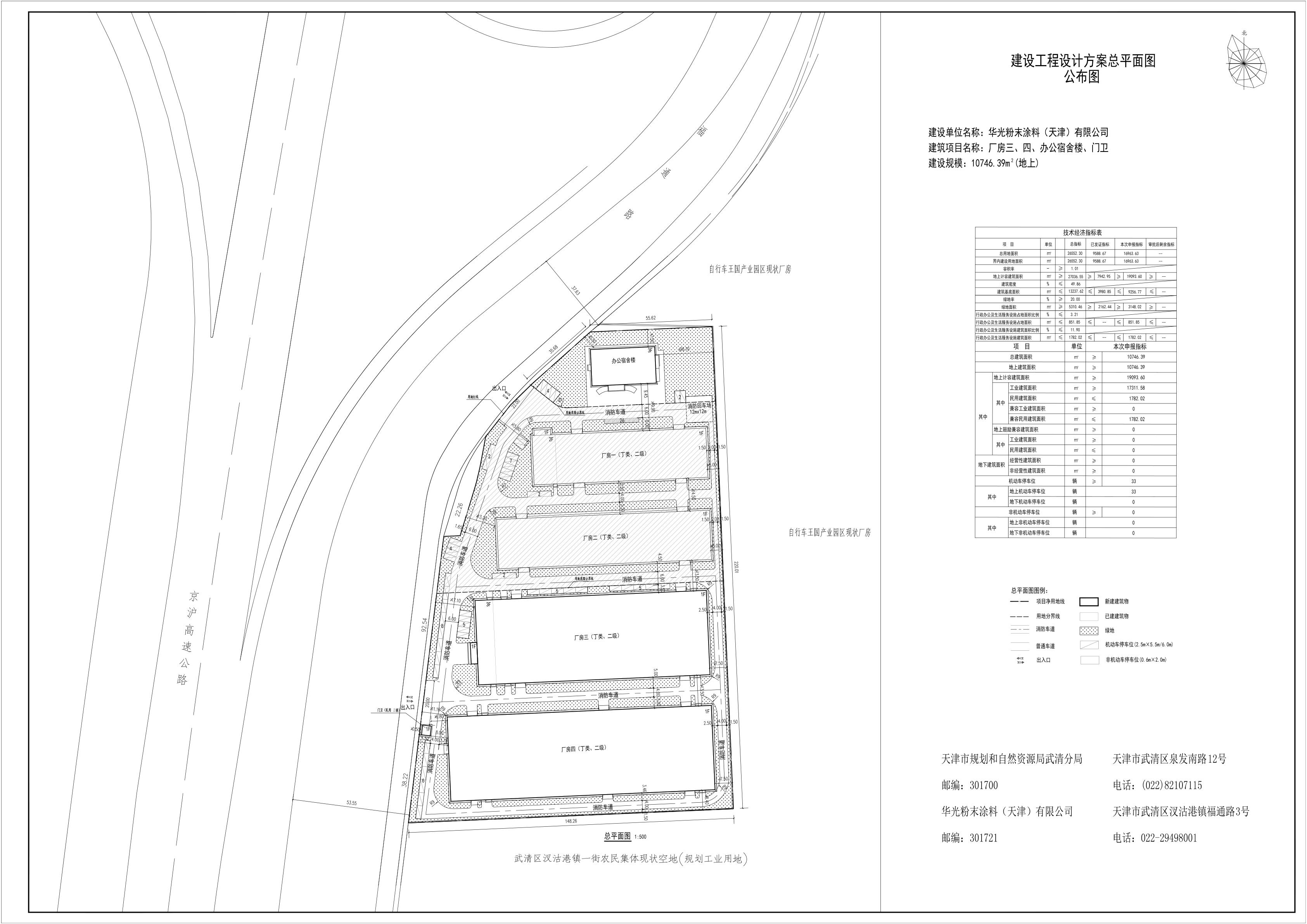 依据《中华人民共和国城乡规划法》《天津市城乡规划条例》等相关法律法规的有关要求,现将华光粉末涂料(天津)有限公司厂房三、四、办公宿舍楼、门卫项目建设工程设计方案总平面图进行公布,公布期限自《建设工程规划许可证》批后至建设项目规划核实合格为止。