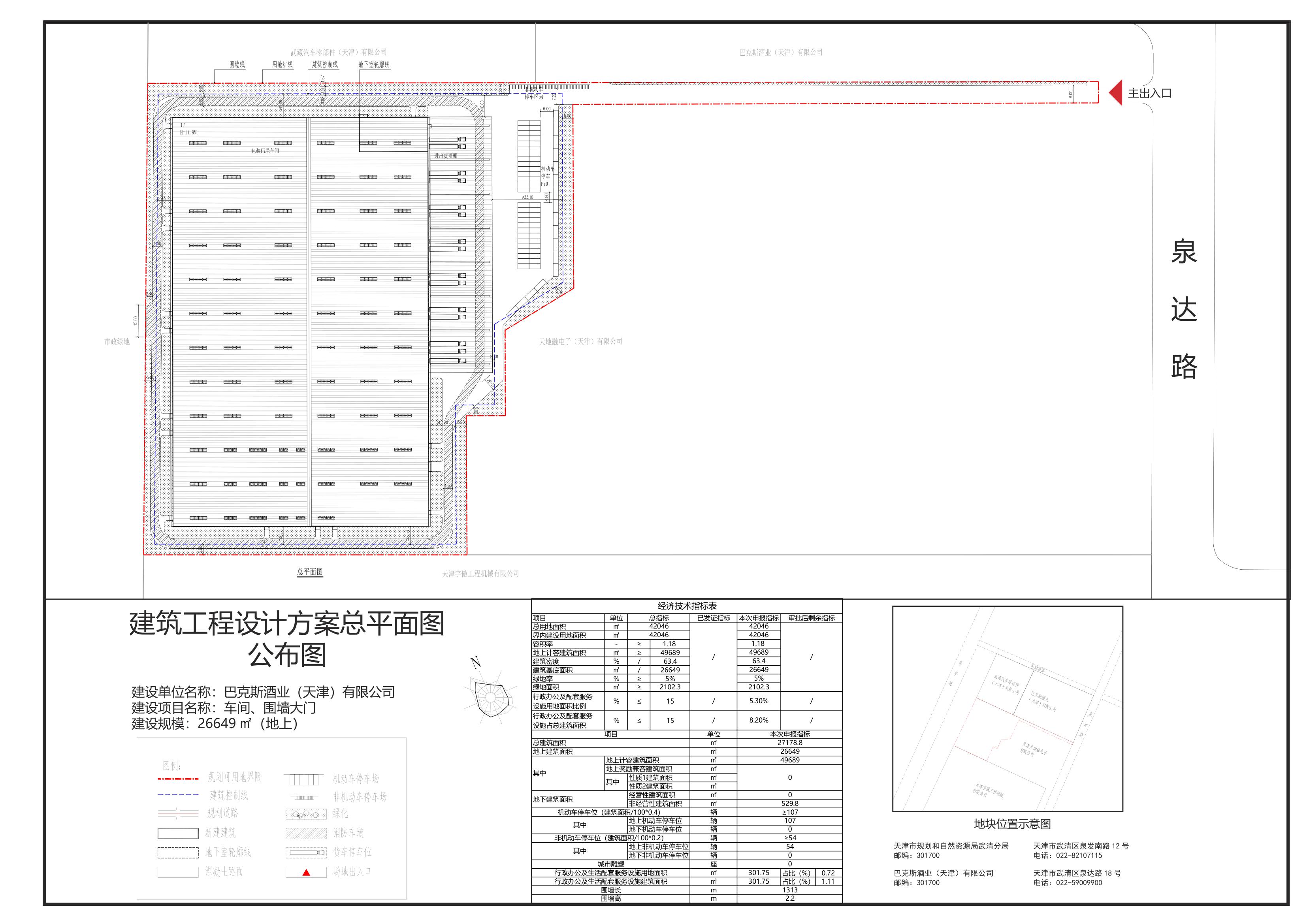 依据《中华人民共和国城乡规划法》《天津市城乡规划条例》等相关法律法规的有关要求,现将巴克斯酒业(天津)有限公司车间、围墙大门项目建设工程设计方案总平面图进行公布,公布期限自《建设工程规划许可证》批后至建设项目规划核实合格为止。