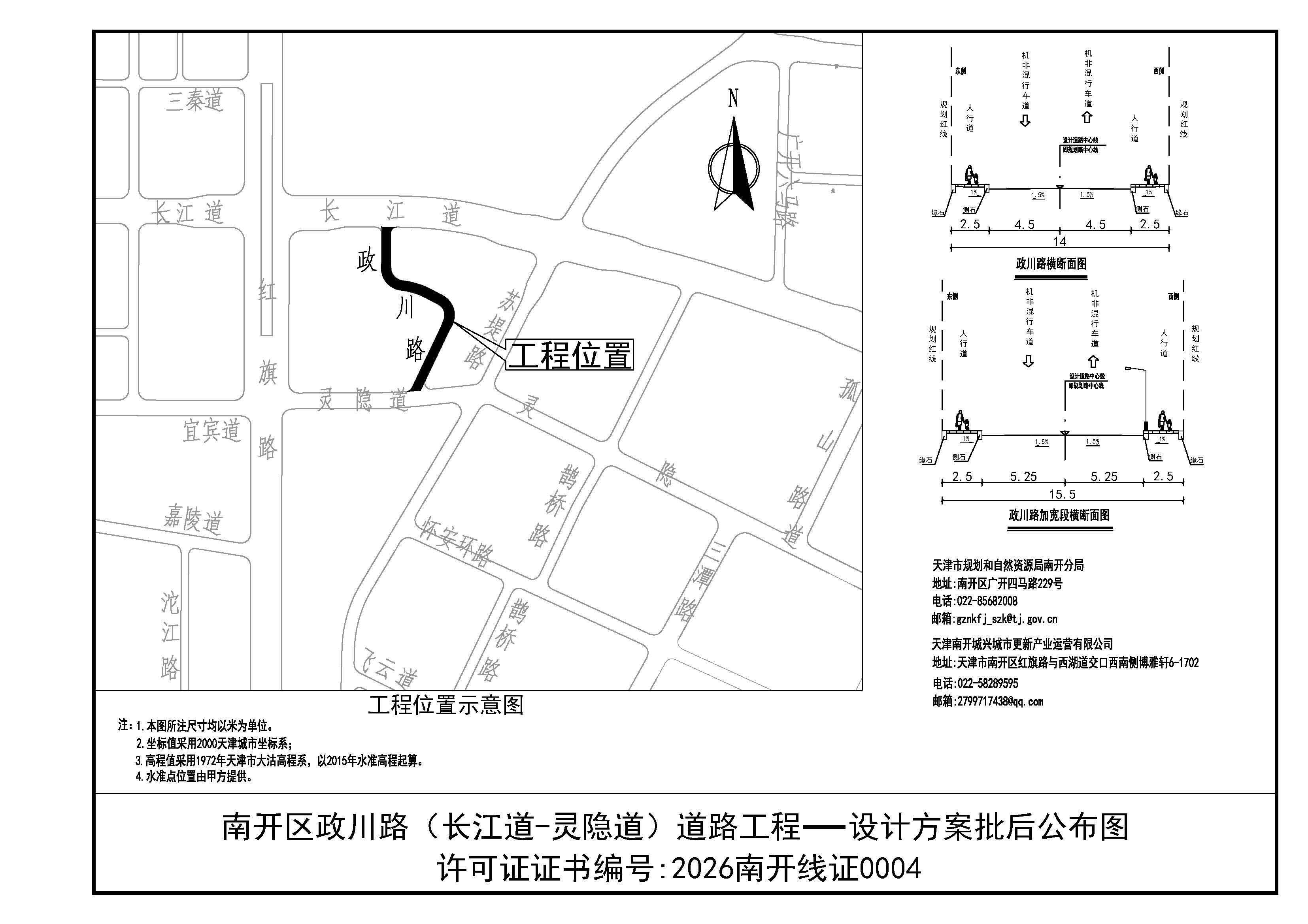 政川路(长江道-灵隐道)道路工程《建设工程规划许可证》已审批,审批时间为2026年01月28日,证书编号为2026南开线证0004。按照《中华人民共和国城乡规划法》《天津市城乡规划条例》的要求,现将该项目建设工程设计方案(位置示意图、横断面图)公布,公布时间至项目规划验收合格。