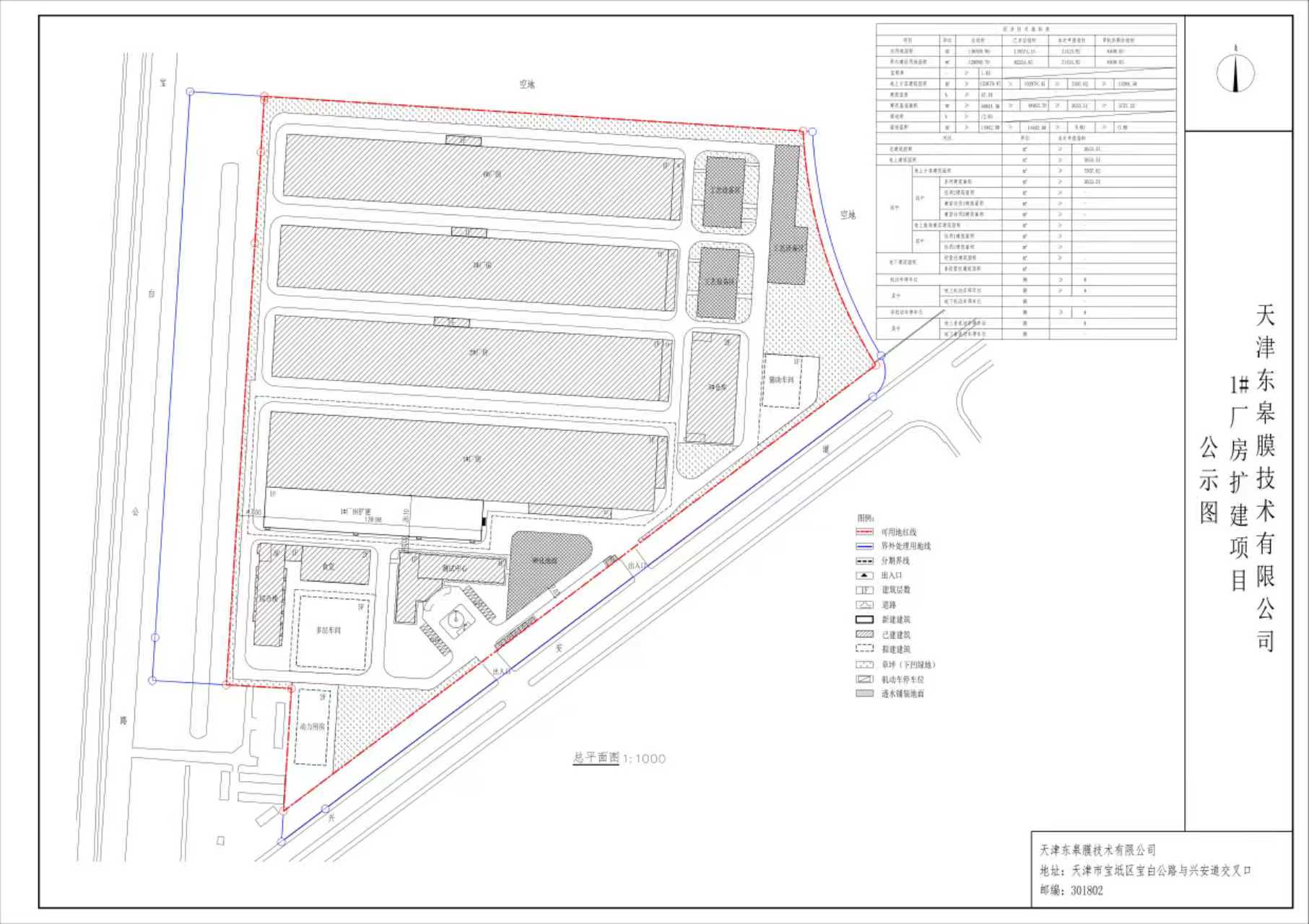 天津市规划和自然资源局宝坻分局于2026年2 月12日核发了天津东皋膜技术有限公司1#厂房扩建项目建设工程规划许可证。依据《中华人民共和国城乡规划法》及住房和城乡建设部《关于城乡规划公开公示的规定》的有关要求,现将该项目总平面图公布,公布期限为信息发布之日起至建设项目规划验收合格为止。