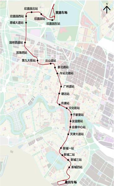 全线共设欣嘉园东站、欣嘉园站、欣嘉园北站、欣嘉园西站、港城大道站、国祥西道站、滨海西站、第九大街站、云山道站、新北路站、车站北路站、广州道站、塘沽站、外滩公园站、文化街站、于家堡站、友谊道站、会展中心站、天津大道站、新城一站、新城二站、新城三站、新城四站等23座车站。(站名均为暂命名)