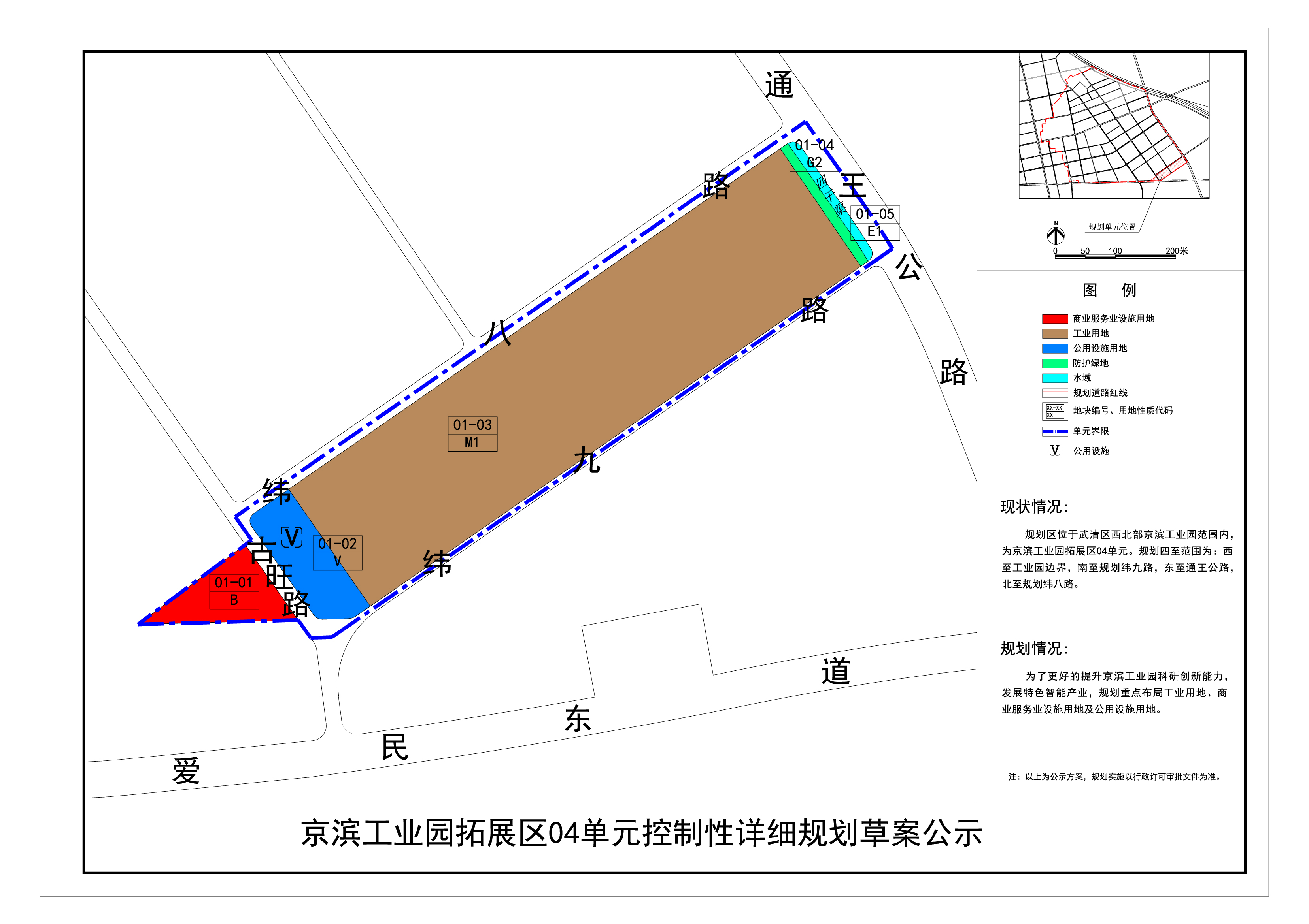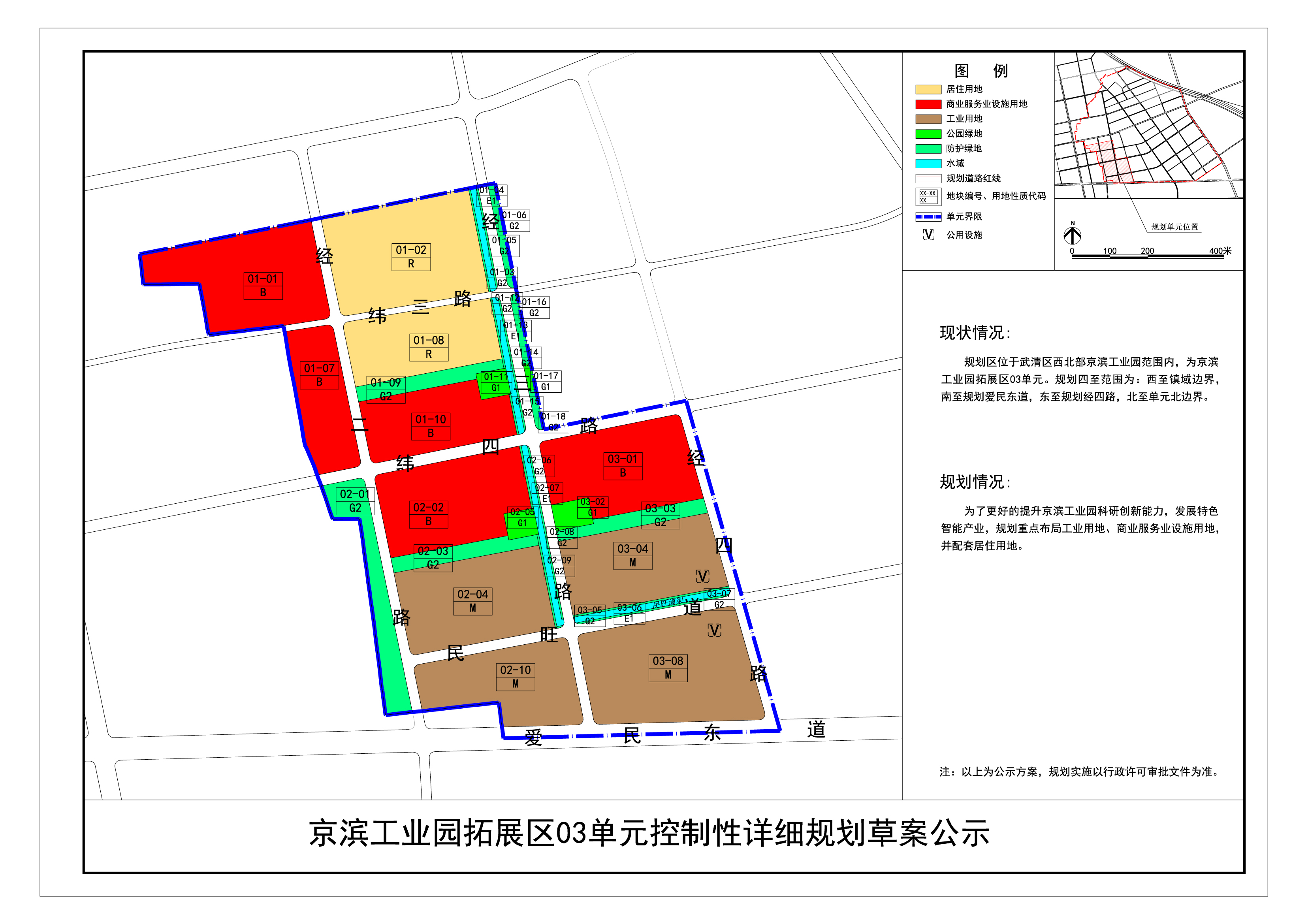 为进一步促进区域发展,落实市重点项目的稳步推进,现已编制完成京滨工业园拓展区03、04单元控制性详细规划草案 。依据《中华人民共和国城乡规划法》和《关于印发<天津市城乡规划公开实施方案>的通知》的有关要求,现将该控制性详细规划草案进行公示,公示时间为30个工作日。