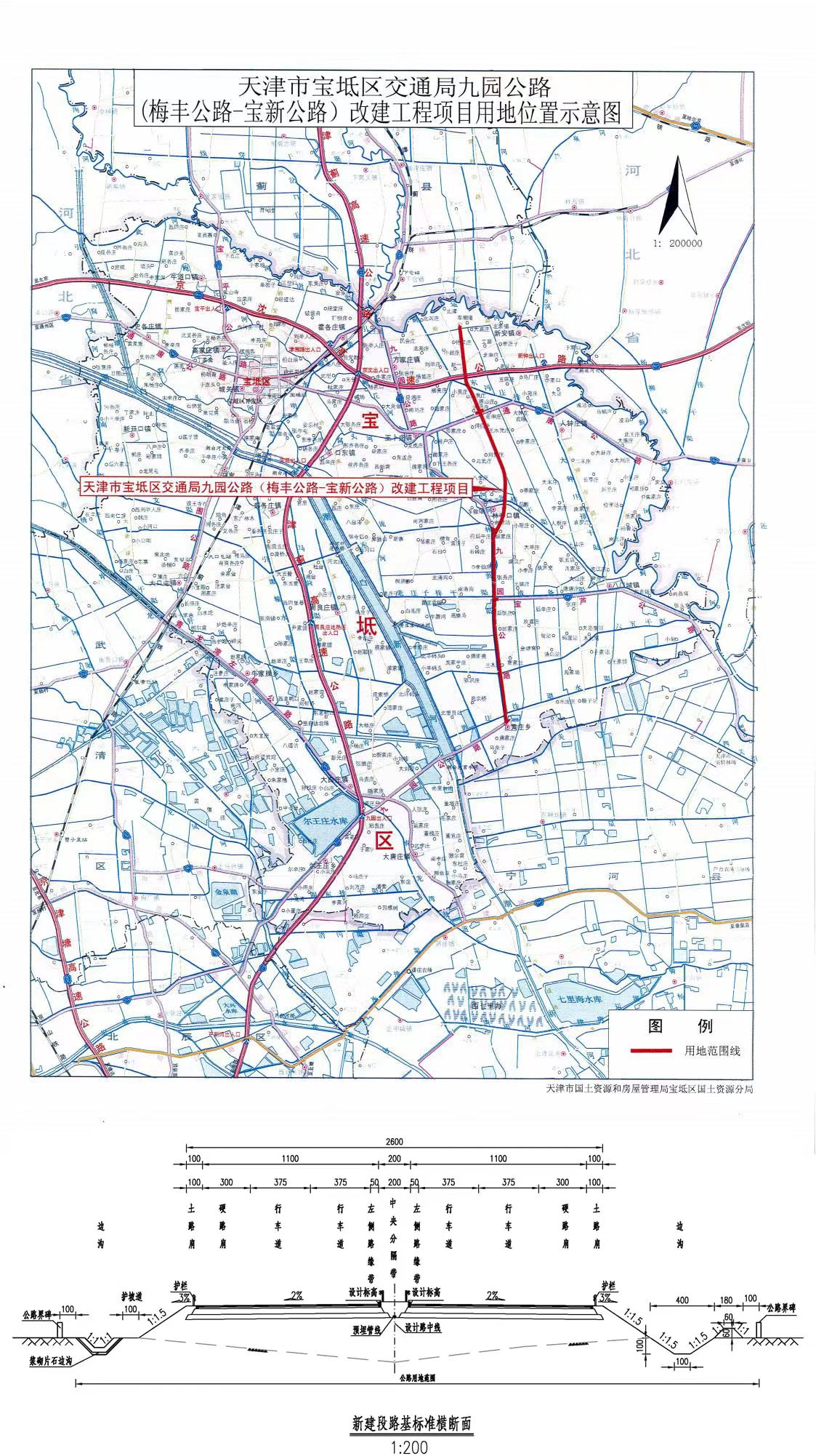 依据《中华人民共和国城乡规划法》和住房城乡建设部《关于城乡规划公开公示的规定》等相关规定要求,现将天津市宝坻区交通局申请九园公路(梅丰公路-宝新公路)改建工程建设工程设计方案(位置示意图、横断面图)公示,公示时间为7个工作日( 从2022年11月17日至2022年11月25日)。