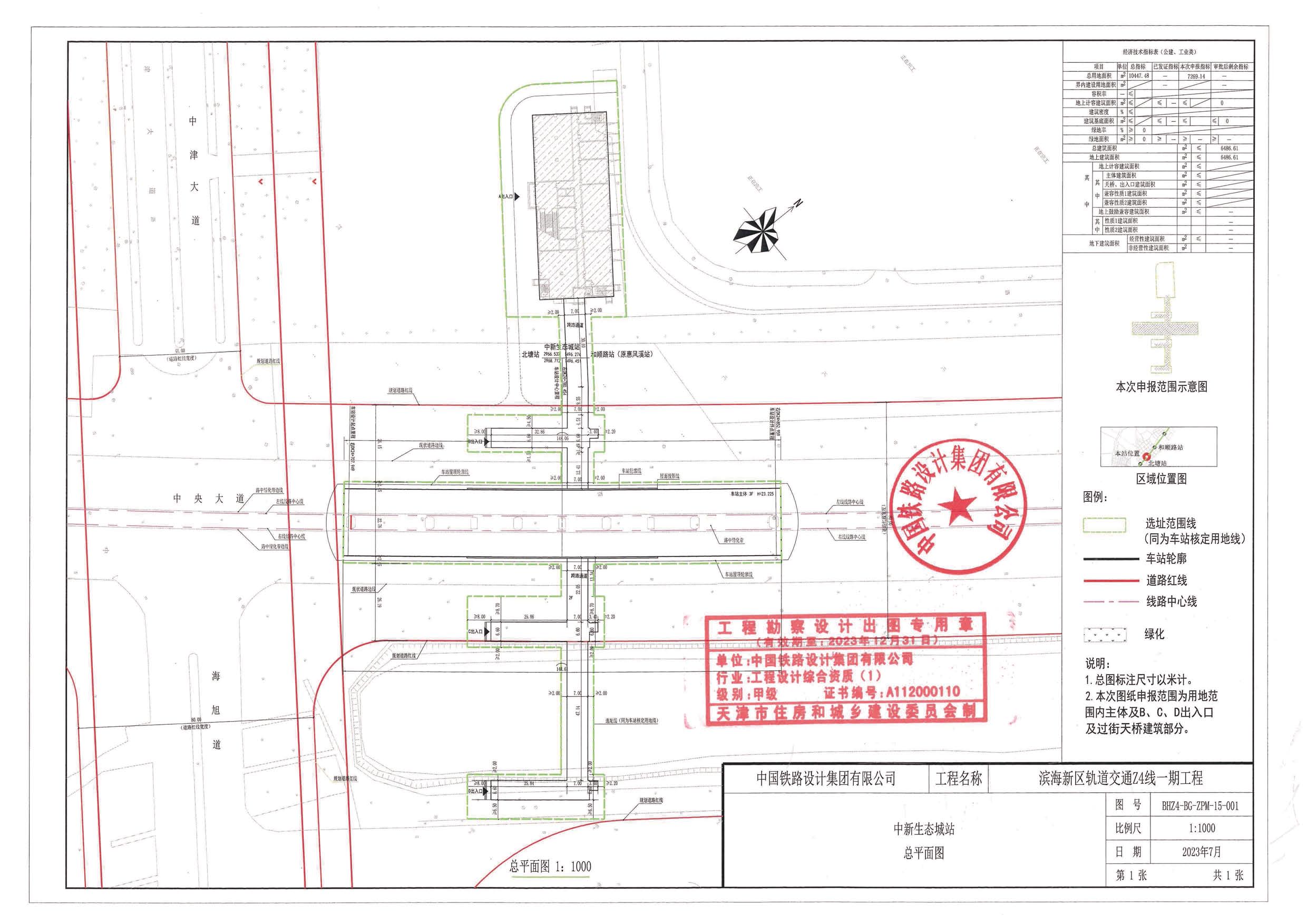 依据《中华人民共和国城乡规划法》和住房和城乡建设部《关于城乡规划公开公示的规定》的有关要求,现将滨海新区轨道交通Z4线一期工程中新生态城站(主体及B、C、D出入口及过街天桥)项目设计方案总平面图进行公示。