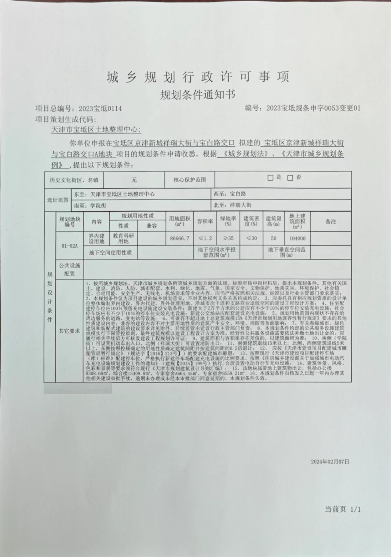 (宝坻区)天津市宝坻区京津新城祥瑞大街与宝白路交口A地块规划条件调整公布