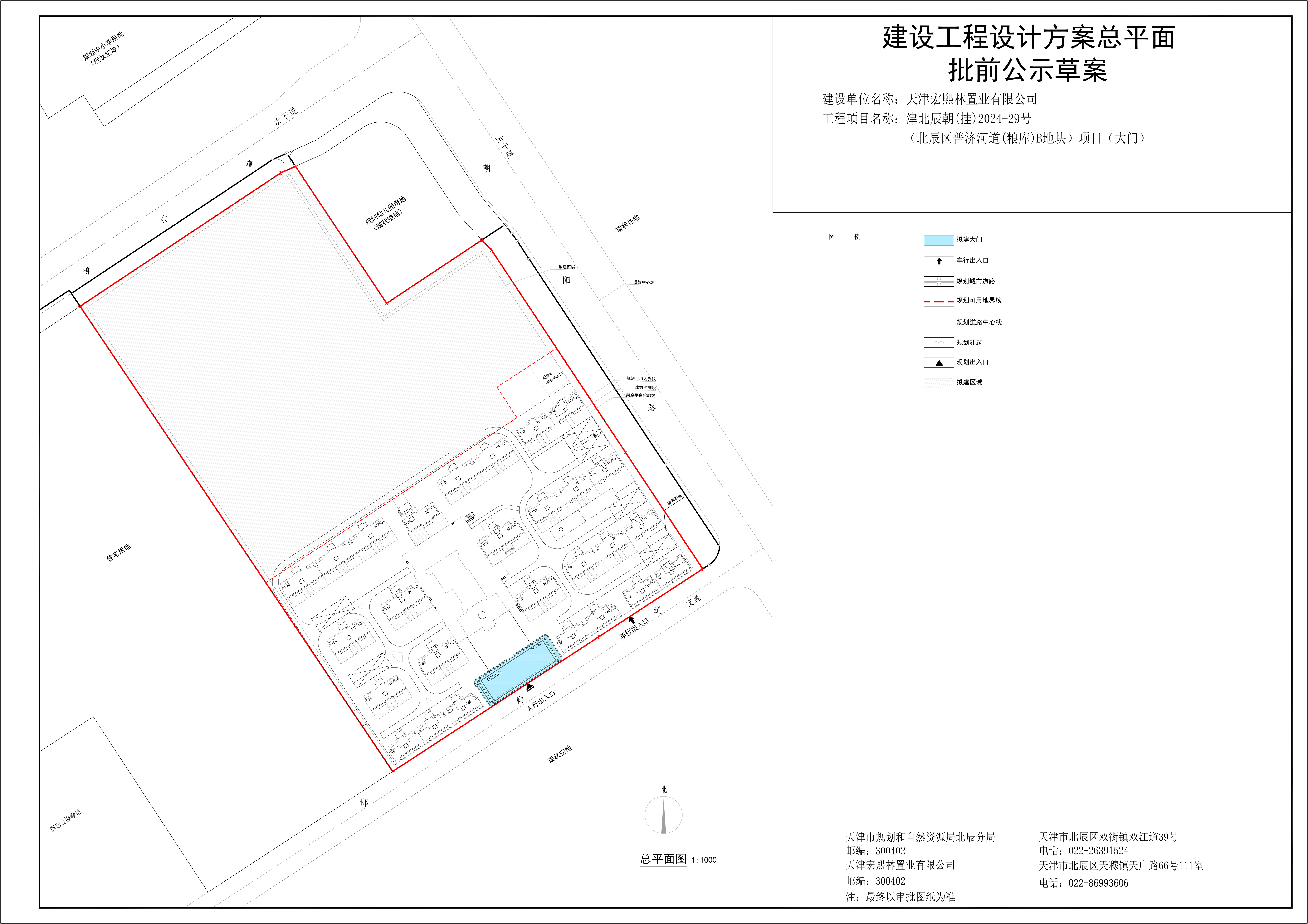 (北辰区)关于天津宏熙林置业有限公司津北辰朝(挂)2024-29号【北辰区普济河道(粮库)B地块】项目(大门)建设工程设计方案总平面图批前的公示