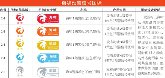 日前,国家海洋局预报减灾司印发《海洋灾害预警报标示符》技术文件,规定了红、橙、黄、蓝、白5级,海浪、海啸、风暴潮、海冰、赤潮、海雾、海水低温、咸潮8类海洋灾害预警信号图标。本期介绍的是海啸预警信号图标。该标识符以海洋灾害的特征为主视觉设计元素,将其图案化、简洁化、视觉化,整体图案抽象表现海洋灾害后果,体现其危害性,增强了识别性。