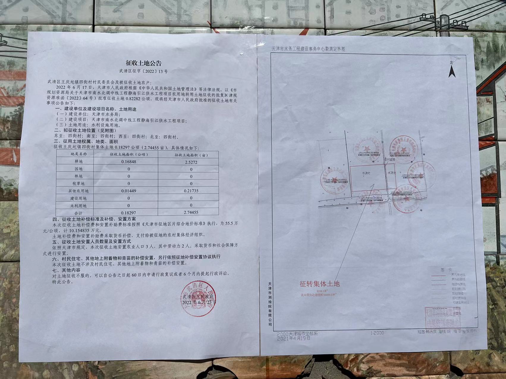2022年6月17日,天津市人民政府根据《中华人民共和国土地管理法》等法律法规,以《市规划资源局关于天津市南水北调中线工程静海引江供水工程项目农用地转用土地征收的批复》(津规资源准函〔2022〕64号)批准征收土地0.82282公顷,现将经天津市人民政府批准的征收土地有关事项公告如下: