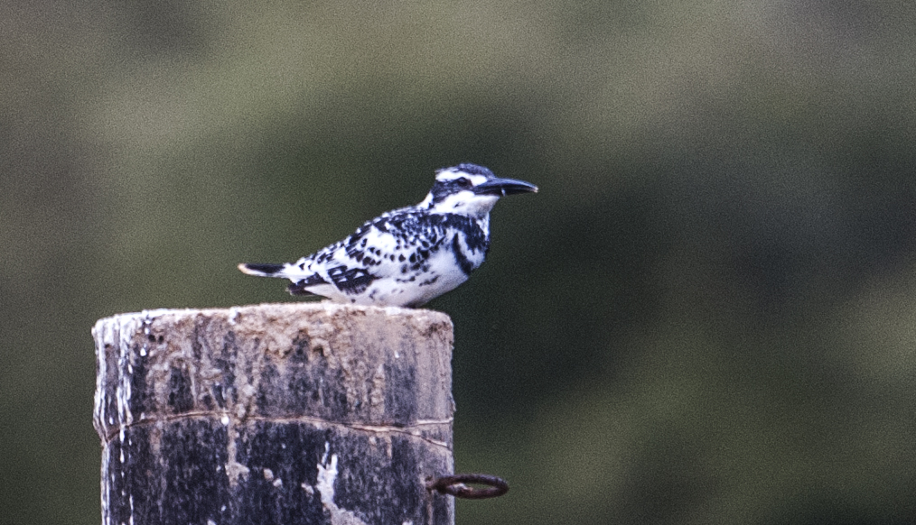 以黑白两色为主。冠羽较小,白色眉纹显著,胸部具黑色条带,易于和冠鱼狗区分开。雄鸟有两条胸带,下面一条较窄,而雌鸟只有一条,且中央不相连。嘴黑色,脚黑色。