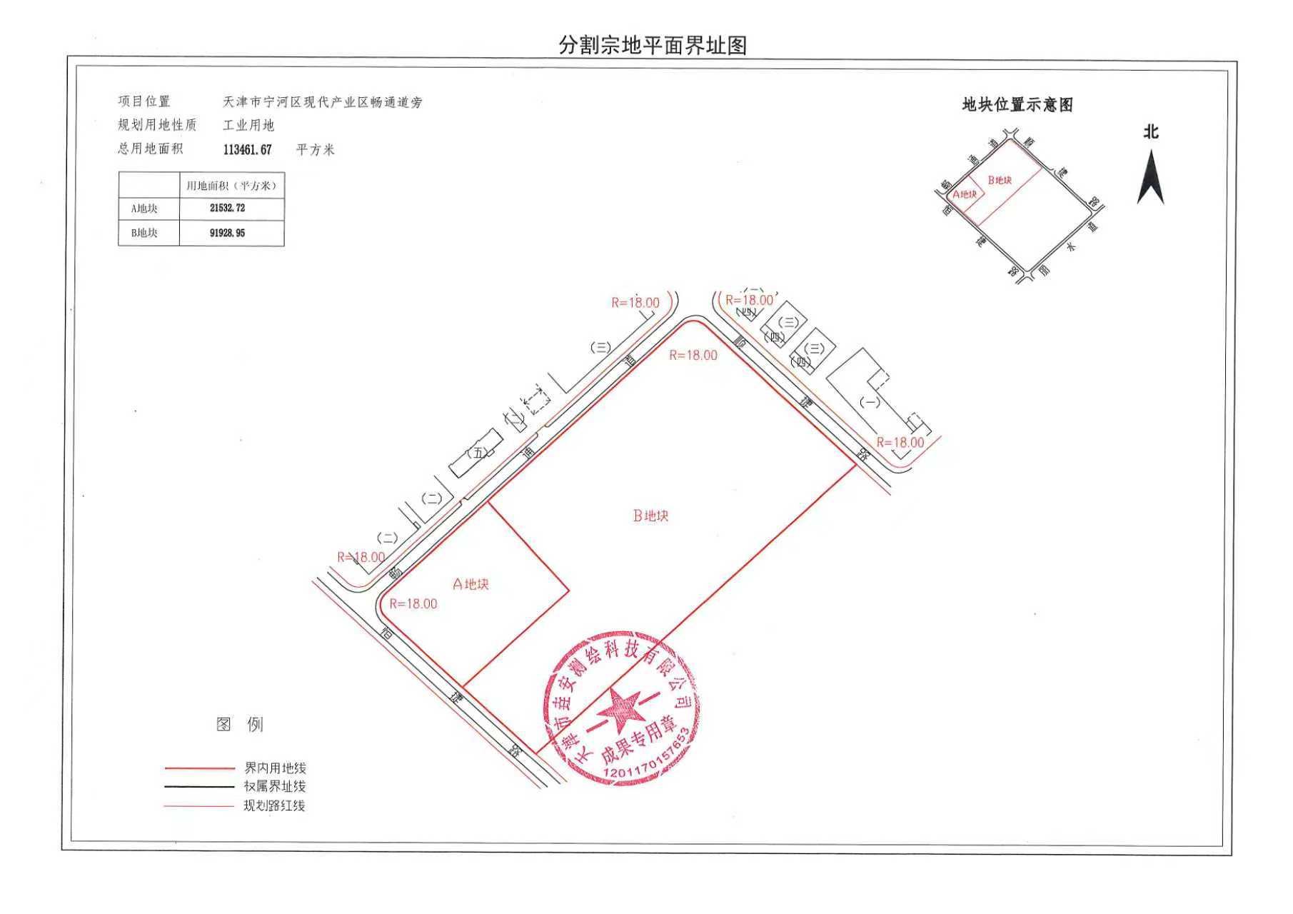 天津宁河现代产业区管理委员会津宁(挂)G2011-17号宗地地块一分割为两个地块,其中地块A面积21532.72平方米,地块B面积为91928.95平方米,且地块A预转让给天津泰丰达科技有限公司。