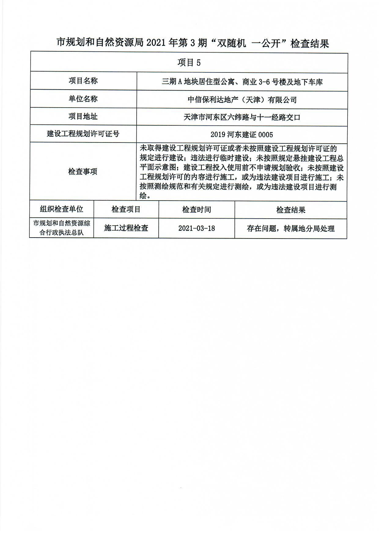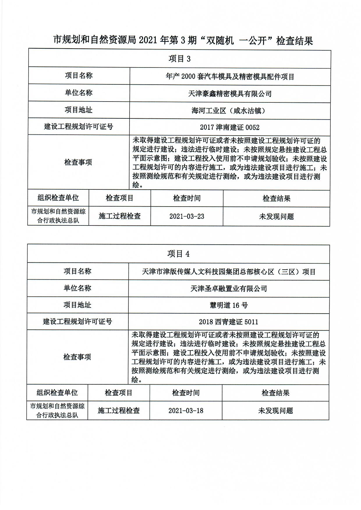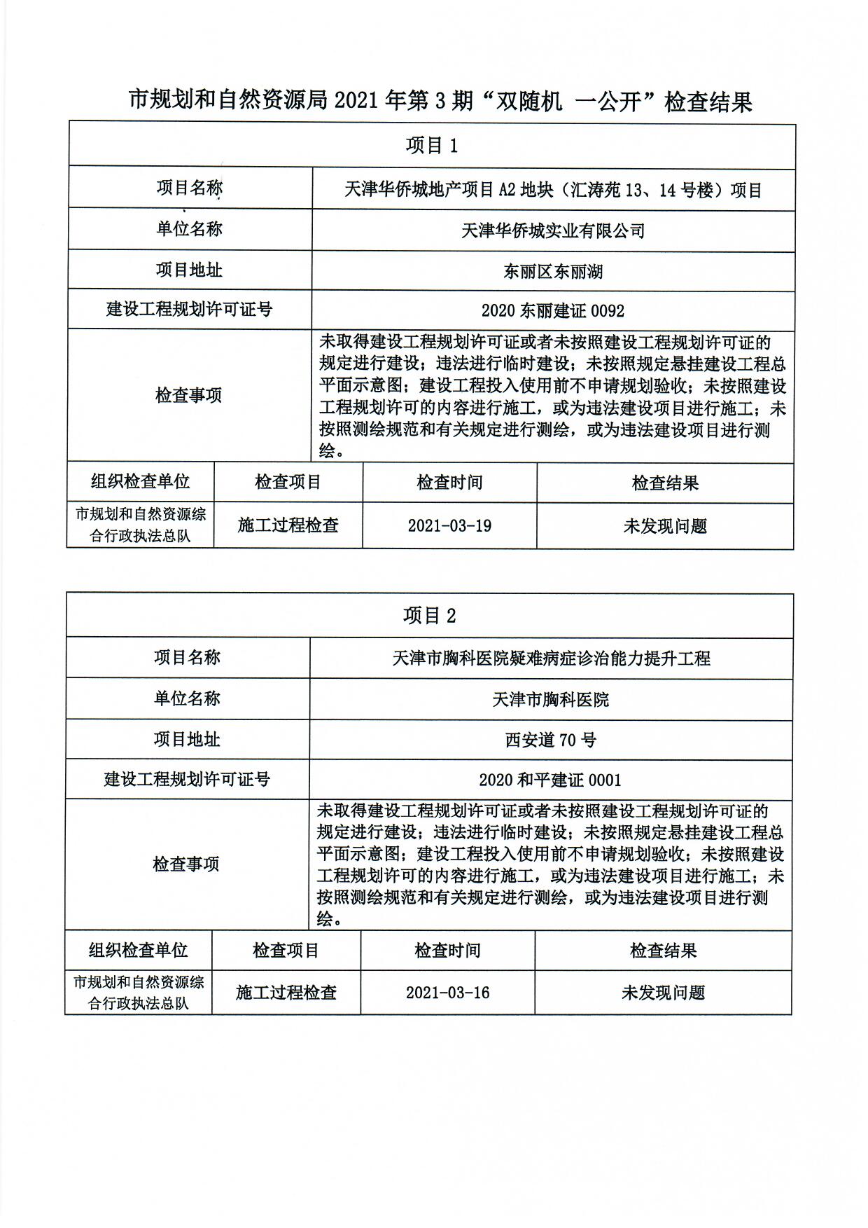天津市规划和自然资源局2021年第3期“双随机、一公开”检查结果